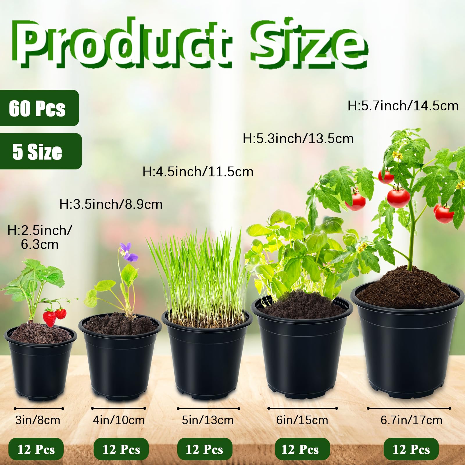 Our plant pots set includes 60pcs pots in 5 different size.Each size contains 12pcs.We have both clear and black colors available.It is a good helper for garden planting.