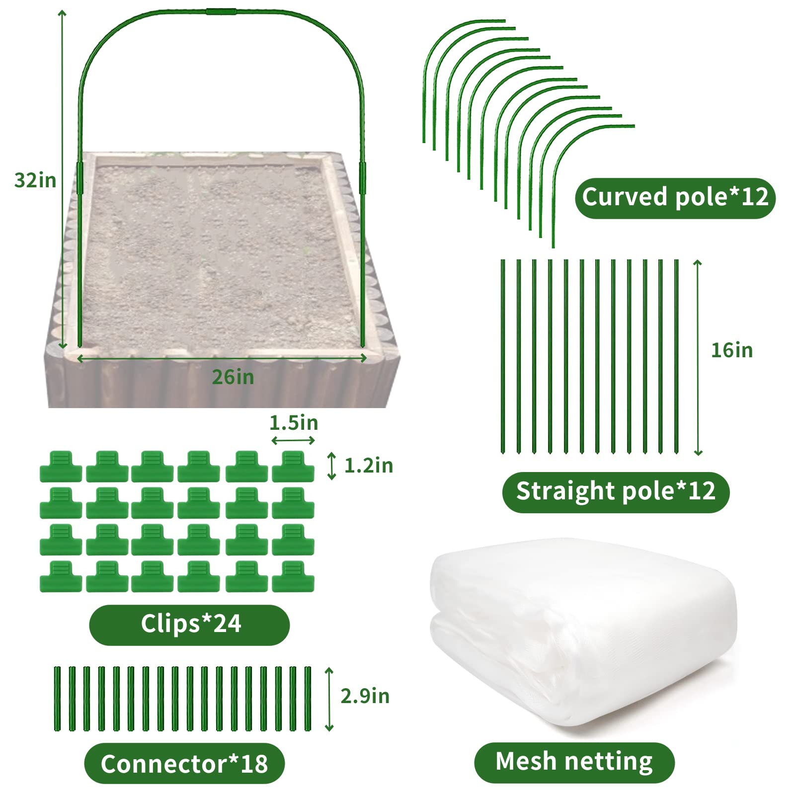 - 【Garden Netting Kit for Raised Beds】The Garden Mesh Netting Kit works well to protect your blueberry, cherries, grapes, tomato, etc. Widely used in pastures, orchards, patio, and gardens, Garden hoops with greenhouse row covers can get a lasting protection for your plants, makes gardenning more easier and fun.