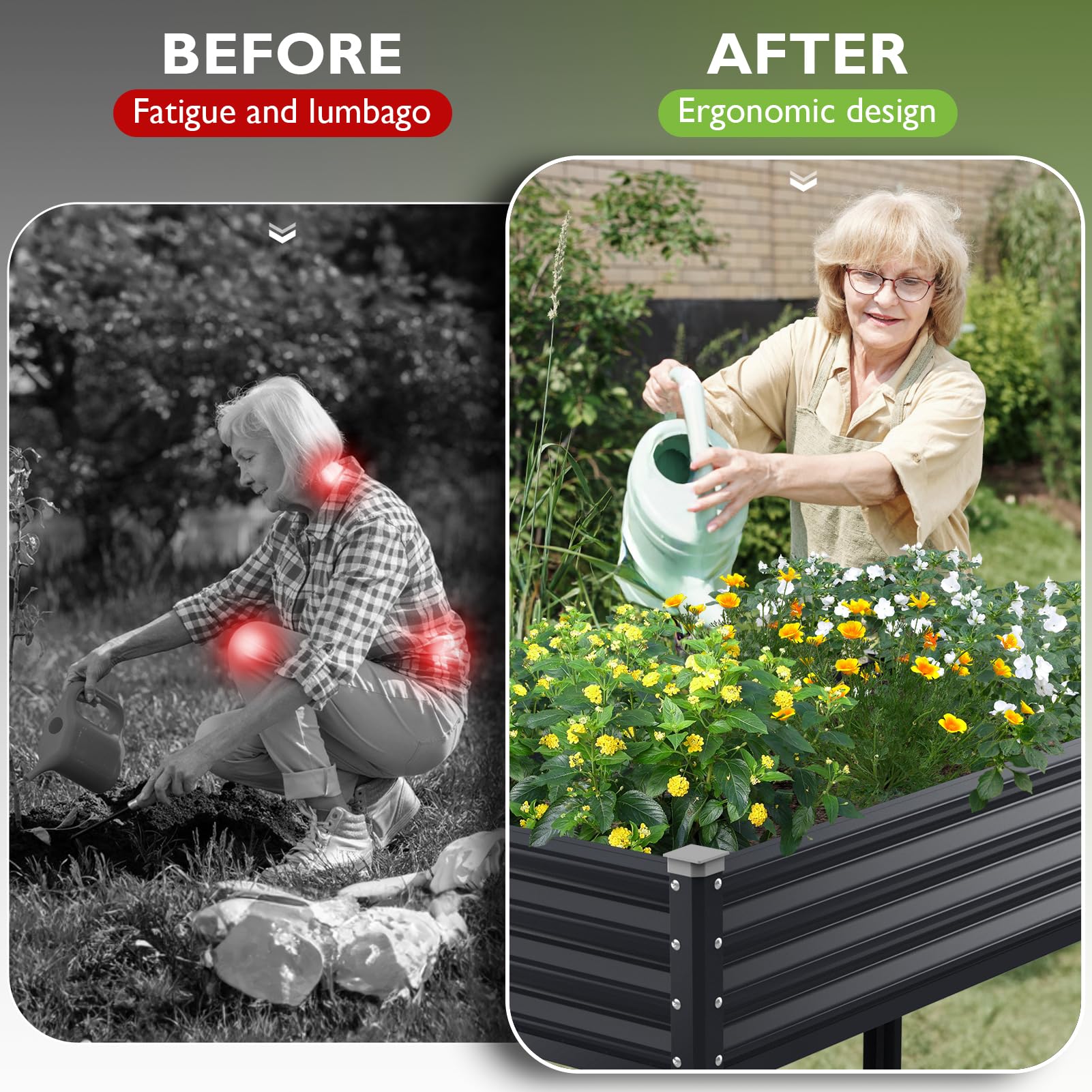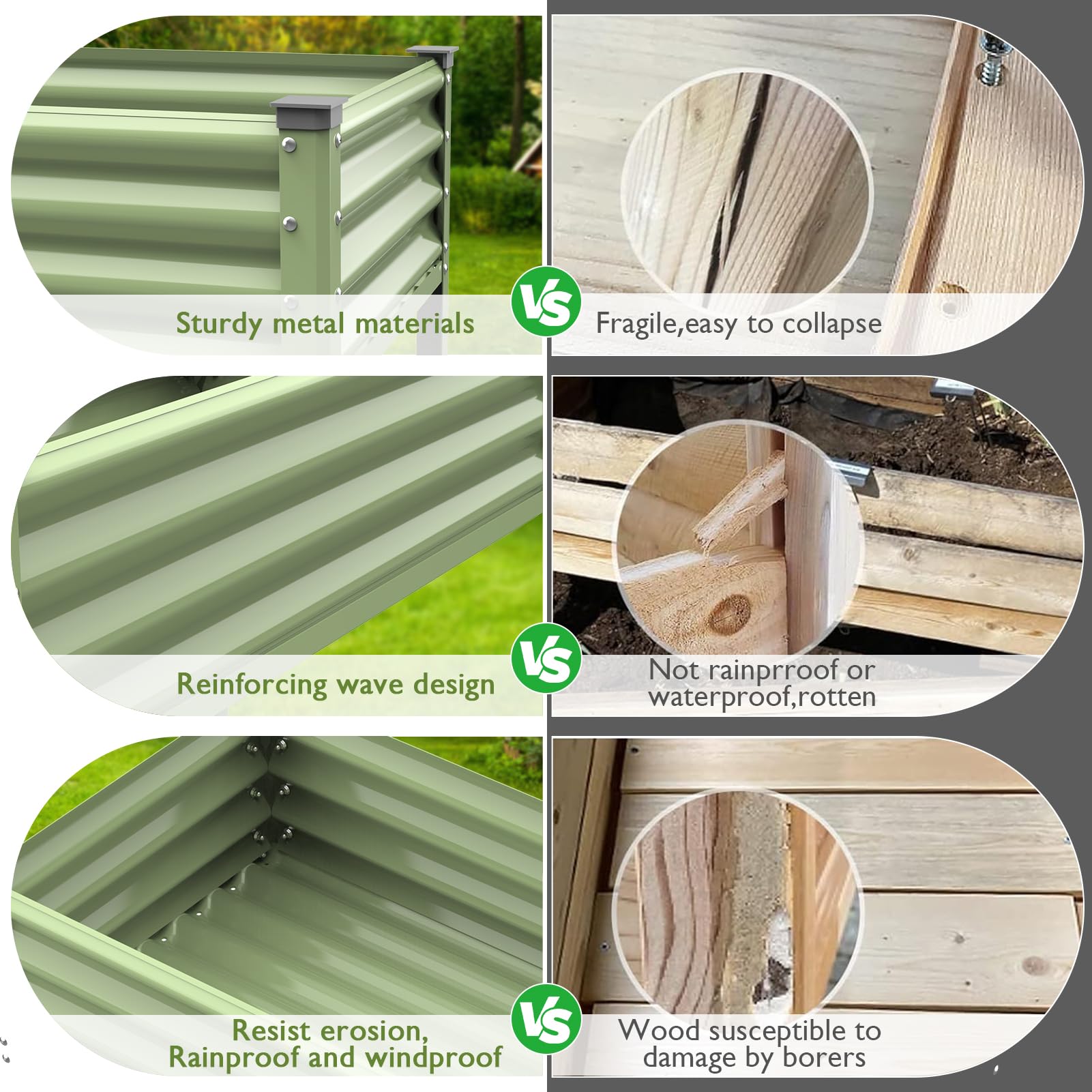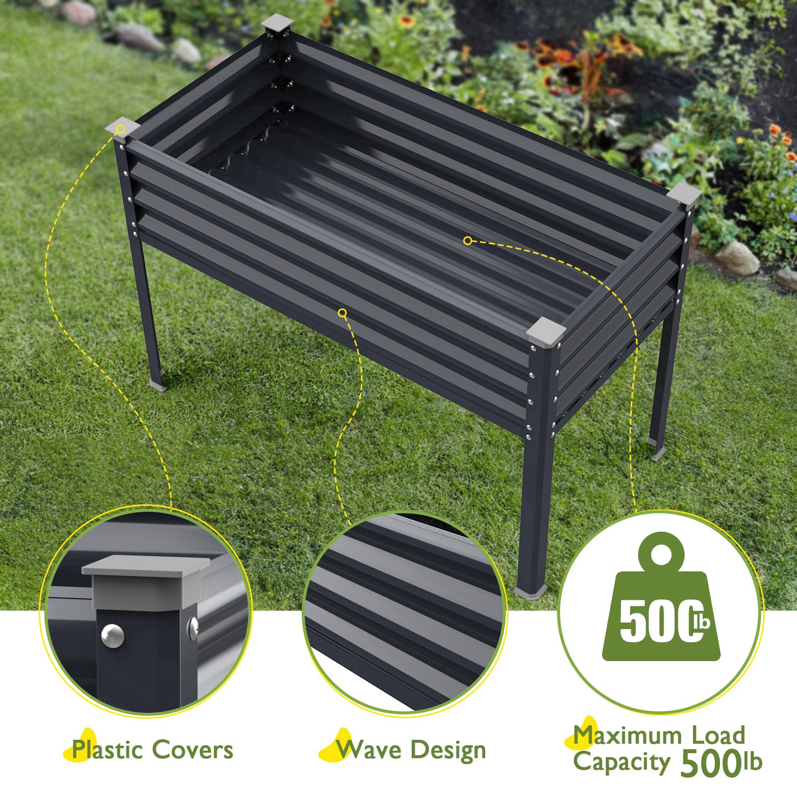 - DOUBLE SIDED DRAINAGE DESIGN: There are drainage designs on both sides of the bottom of the elevated planter box.Allow excess water to drain out and maintain good ventilation to prevent root decay