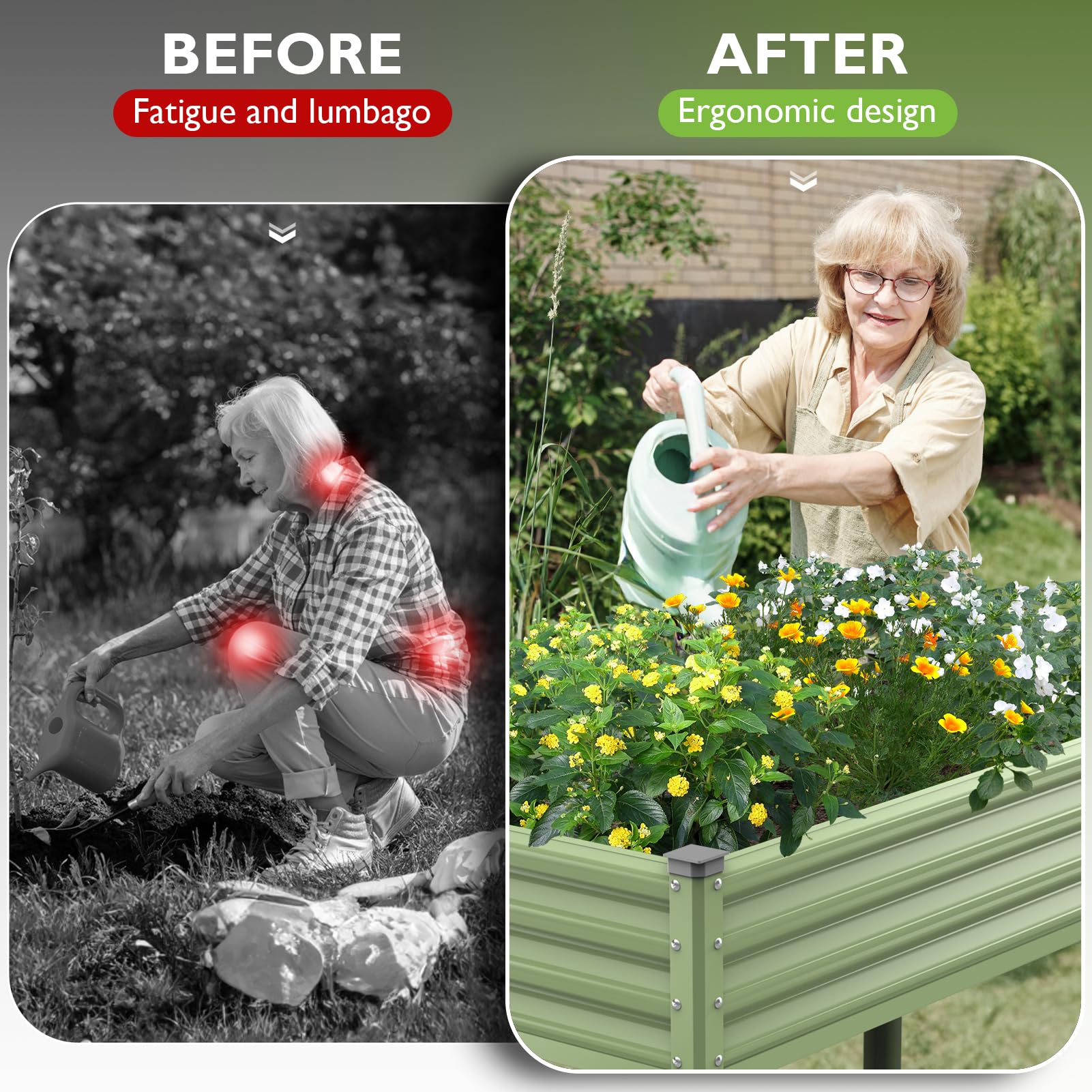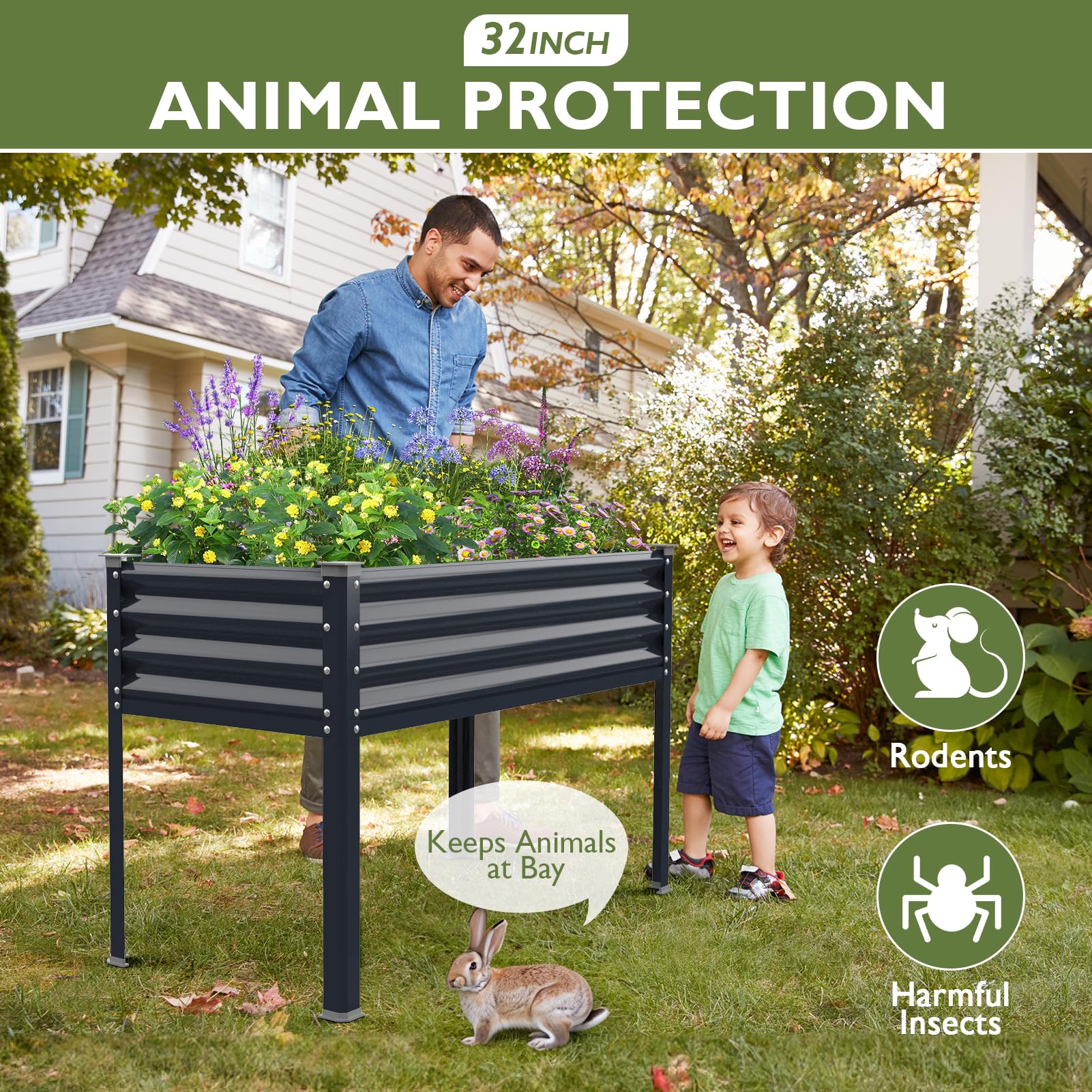 - ERGONOMIC and PROTECTIVE: Stands 32 inches tall, not only protecting your plants from wildlife, weeds and pets, but also providing easier access and less strain on your back and knees when planting. The 4 corners above and below the raised garden bed are protected with pads to keep it from being sharp