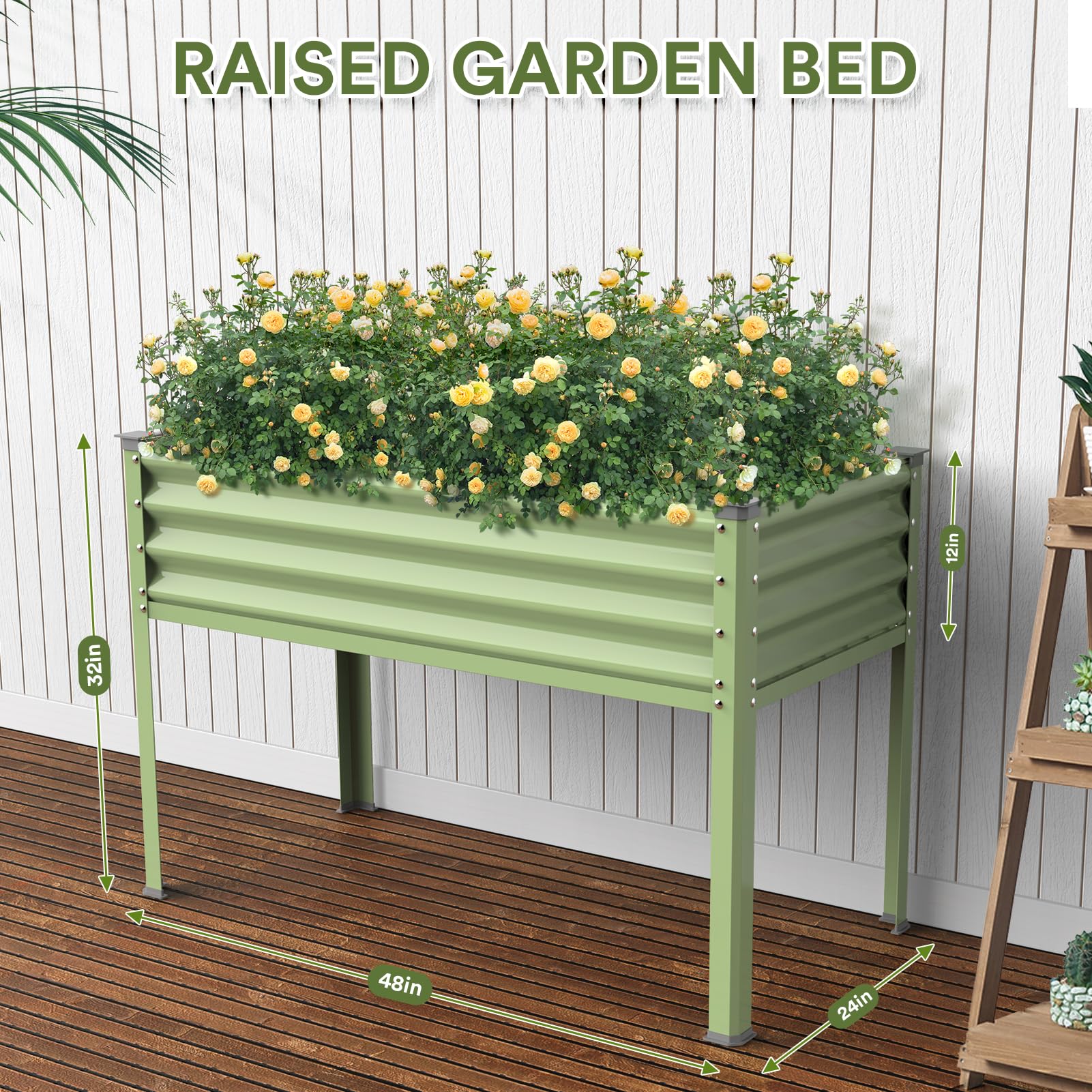 - SPACIOUS GARDEN BED: 48" (L)x 24" (W)x 32" (H), 57 gallons, 216L capacity. This raised garden bed with legs provides ample growing space to raise vegetables, flowers, herb, fruits and plants.Ideal for gardens, patios, greenhouse, backyards, balconies and any other outdoor setting