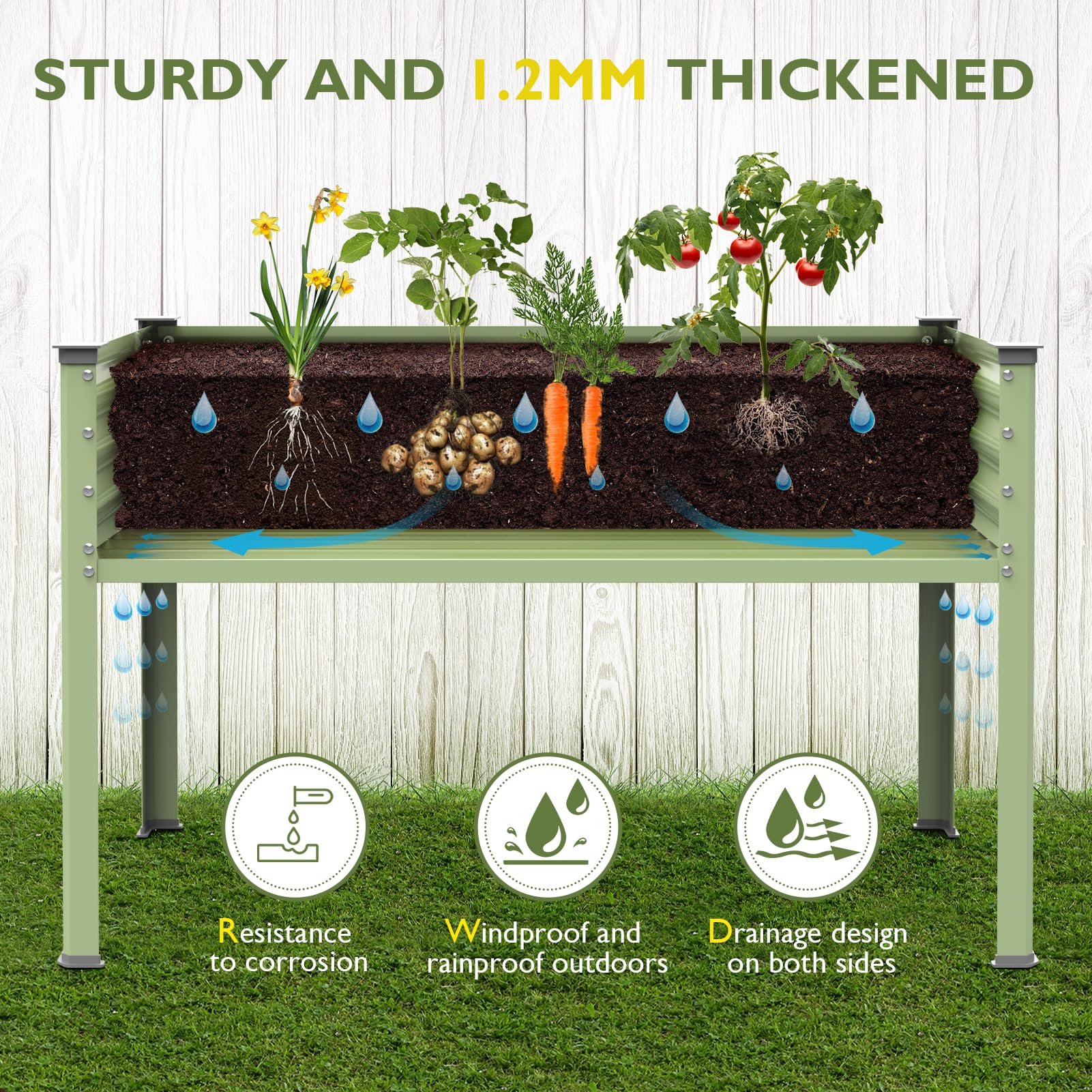 - BUILT TO LAST MATERIAL: The garden planter box with legs is made of 1.2 mm thick layer of solid steel plate with anti-rust coating,and the complete screws are made of stainless steel, rust-proof and durable, can stay in contact with the soil for a long time and resist corrosion